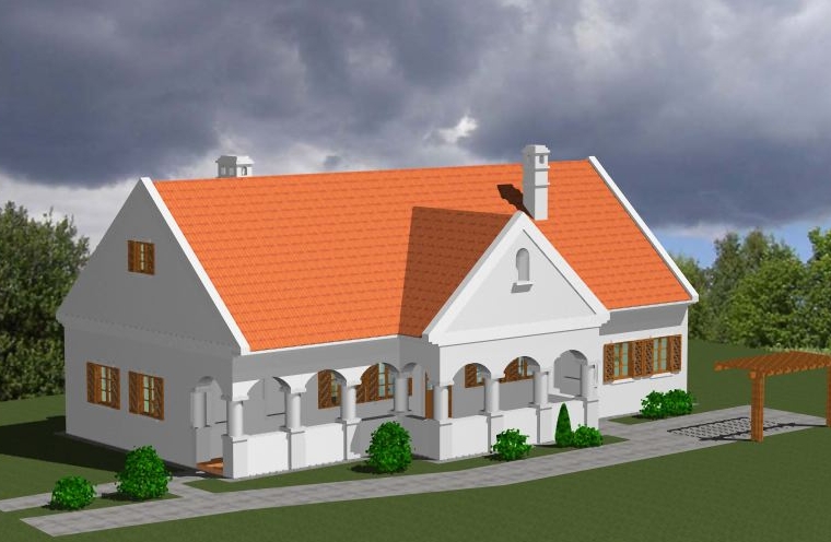 A falu utcaképéhez illeszkedő, a hagyományokhoz visszanyúló, megjelenésében a klasszikus, háromosztatú parasztház terve. Tömege, aránya, formája a régmúlt időket idézi. Belső elrendezésében egy központi lakótérre szervezett épület. A ház központi élettere a konyha-étkező, melyből közvetlenül nyílik a nappali nyugati irányban, illetve keleti irányban a fürdő-gardrob-háló egység. A konyha-étkezőnek déli irányban, a kibővített tornácon keresztül jön létre a kertkapcsolata.